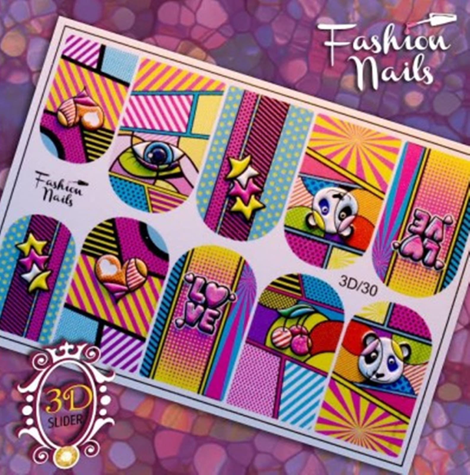 FASHION NAILS Water decal 3D #30, 1 pz. Istruzioni per l'uso: 1. Effettuare una preparazione standard della lamina ungueale.2. Selezionare il modello appropriato, tagliare l'immagine alla dimensione dell'unghia. 3. Applicare la base,polimerizzare. Applicare uno strato sottile del semipermanente bianco, se richiesto dal design del water decal. Polimerizzare. 4. Applicare uno strato sottile della base. Non polimerizzare. 5. Mettere il water decal su un disco di cotone inumidito con acqua calda (non fredda!) Per circa 10-15 secondi. Spostarlo trasferendo la pellicola sull'unghia. Raddrizzare la pellicola, tirando leggermente verso l'alto il bordo libero. Distendere con cura le pieghe, estraendo i resti di aria e acqua con un panno morbido, un pennello piatto o con le dita. Polimerizzare a tempo pieno. (UV - 2 min, led -30-60 sec). 6. Utilizzando la lima fine, dall'alto verso il basso, rimuovere delicatamente la pellicola in eccesso dal bordo libero dell'unghia. 7. Coprire 2 volte con il top coat, ben sigillando il bordo libero.