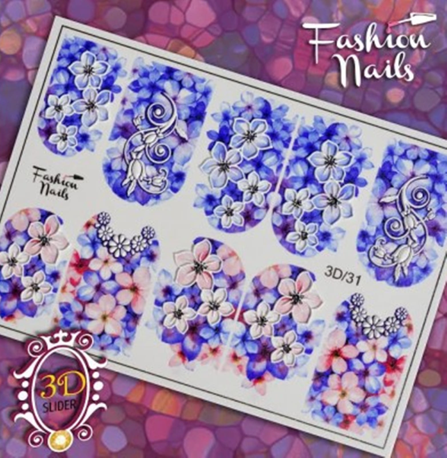 FASHION NAILS Water decal 3D #31, 1 pz. Istruzioni per l'uso: 1. Effettuare una preparazione standard della lamina ungueale.2. Selezionare il modello appropriato, tagliare l'immagine alla dimensione dell'unghia. 3. Applicare la base,polimerizzare. Applicare uno strato sottile del semipermanente bianco, se richiesto dal design del water decal. Polimerizzare. 4. Applicare uno strato sottile della base. Non polimerizzare. 5. Mettere il water decal su un disco di cotone inumidito con acqua calda (non fredda!) Per circa 10-15 secondi. Spostarlo trasferendo la pellicola sull'unghia. Raddrizzare la pellicola, tirando leggermente verso l'alto il bordo libero. Distendere con cura le pieghe, estraendo i resti di aria e acqua con un panno morbido, un pennello piatto o con le dita. Polimerizzare a tempo pieno. (UV - 2 min, led -30-60 sec). 6. Utilizzando la lima fine, dall'alto verso il basso, rimuovere delicatamente la pellicola in eccesso dal bordo libero dell'unghia. 7. Coprire 2 volte con il top coat, ben sigillando il bordo libero.