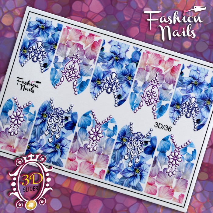 FASHION NAILS Water decal 3D #36, 1 pz. Istruzioni per l'uso: 1. Effettuare una preparazione standard della lamina ungueale.2. Selezionare il modello appropriato, tagliare l'immagine alla dimensione dell'unghia. 3. Applicare la base,polimerizzare. Applicare uno strato sottile del semipermanente bianco, se richiesto dal design del water decal. Polimerizzare. 4. Applicare uno strato sottile della base. Non polimerizzare. 5. Mettere il water decal su un disco di cotone inumidito con acqua calda (non fredda!) Per circa 10-15 secondi. Spostarlo trasferendo la pellicola sull'unghia. Raddrizzare la pellicola, tirando leggermente verso l'alto il bordo libero. Distendere con cura le pieghe, estraendo i resti di aria e acqua con un panno morbido, un pennello piatto o con le dita. Polimerizzare a tempo pieno. (UV - 2 min, led -30-60 sec). 6. Utilizzando la lima fine, dall'alto verso il basso, rimuovere delicatamente la pellicola in eccesso dal bordo libero dell'unghia. 7. Coprire 2 volte con il top coat, ben sigillando il bordo libero.