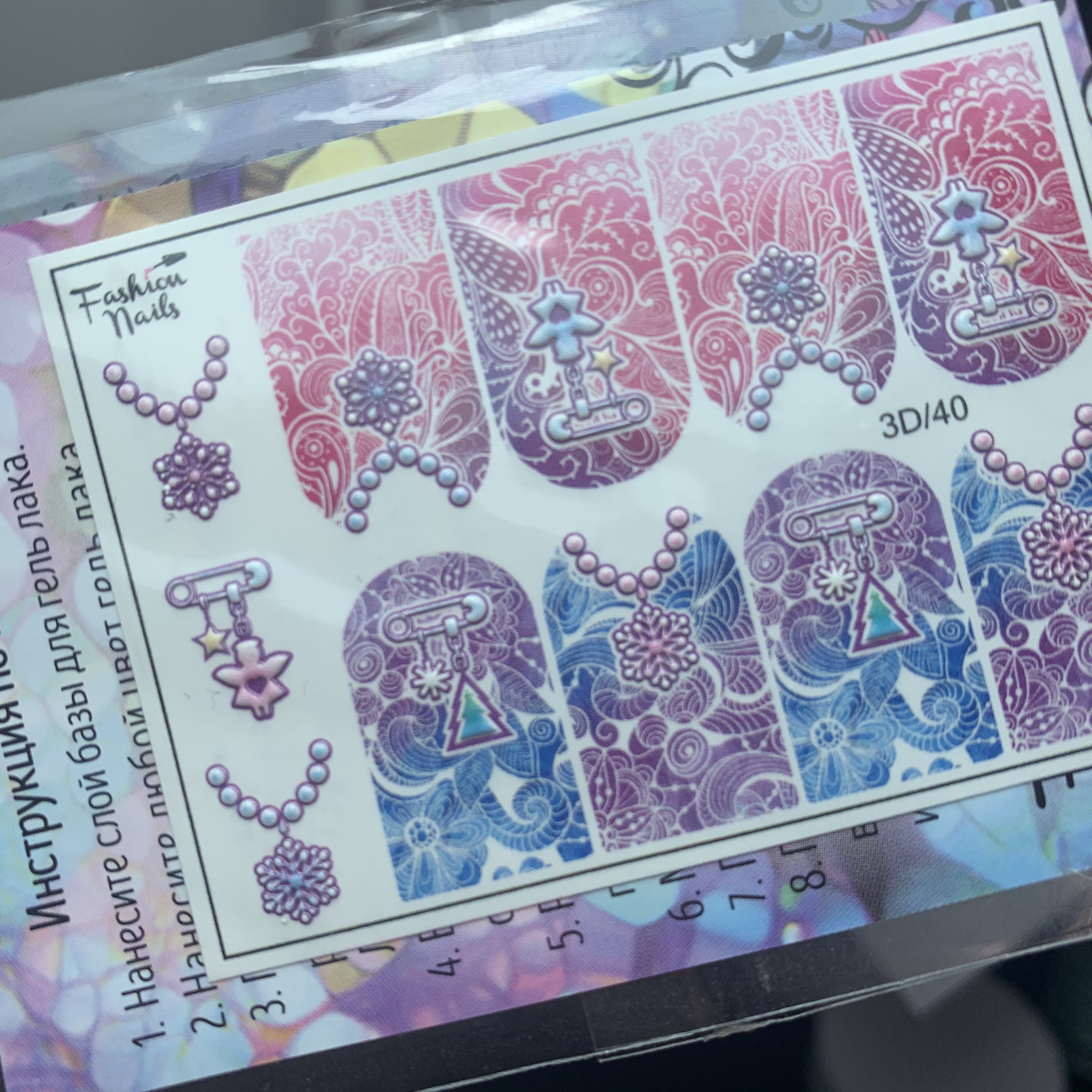 FASHION NAILS Water decal 3D #40, 1 pz. Istruzioni per l'uso: 1. Effettuare una preparazione standard della lamina ungueale.2. Selezionare il modello appropriato, tagliare l'immagine alla dimensione dell'unghia. 3. Applicare la base,polimerizzare. Applicare uno strato sottile del semipermanente bianco, se richiesto dal design del water decal. Polimerizzare. 4. Applicare uno strato sottile della base. Non polimerizzare. 5. Mettere il water decal su un disco di cotone inumidito con acqua calda (non fredda!) Per circa 10-15 secondi. Spostarlo trasferendo la pellicola sull'unghia. Raddrizzare la pellicola, tirando leggermente verso l'alto il bordo libero. Distendere con cura le pieghe, estraendo i resti di aria e acqua con un panno morbido, un pennello piatto o con le dita. Polimerizzare a tempo pieno. (UV - 2 min, led -30-60 sec). 6. Utilizzando la lima fine, dall'alto verso il basso, rimuovere delicatamente la pellicola in eccesso dal bordo libero dell'unghia. 7. Coprire 2 volte con il top coat, ben sigillando il bordo libero.