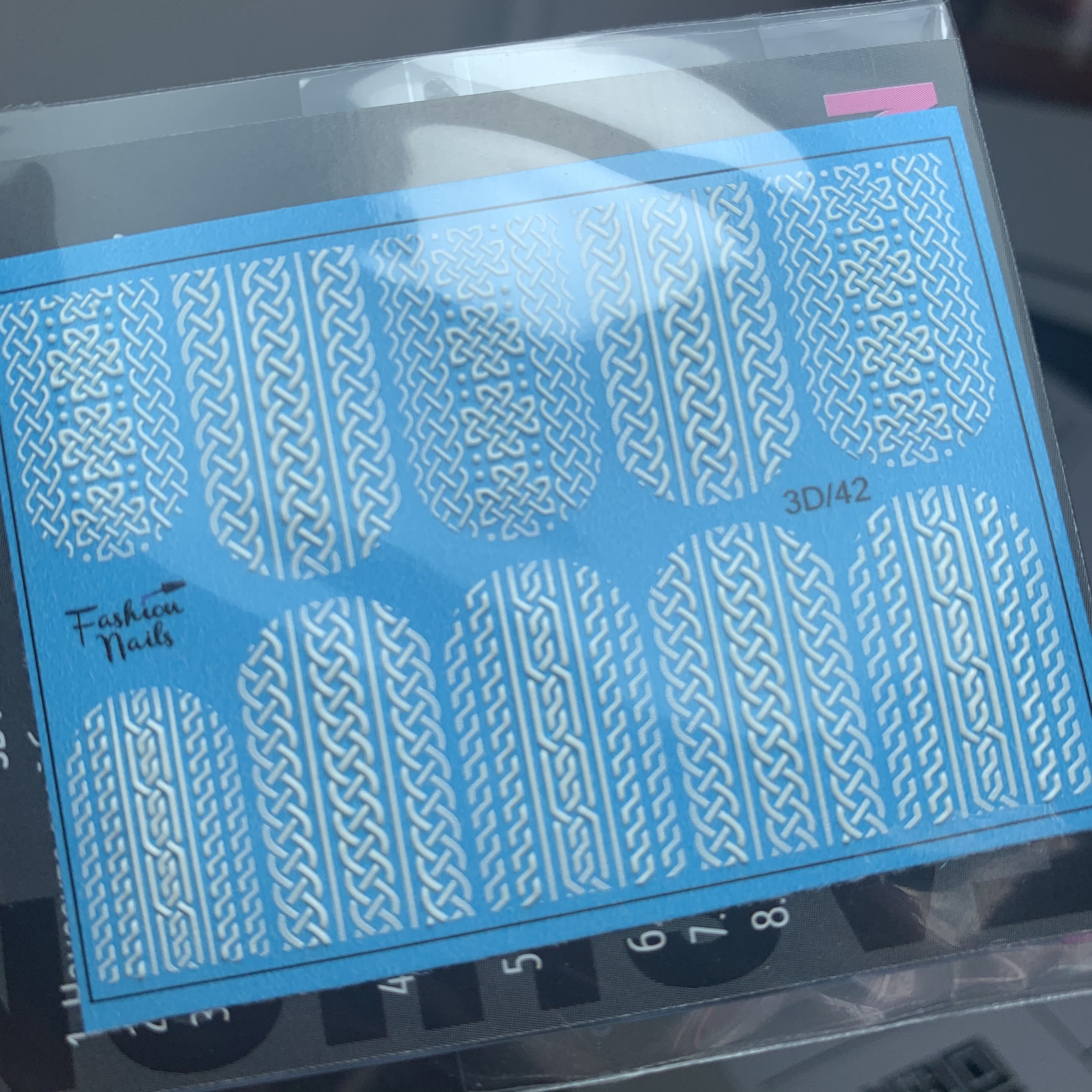 FASHION NAILS Water decal 3D #42, 1 pz. Istruzioni per l'uso: 1. Effettuare una preparazione standard della lamina ungueale.2. Selezionare il modello appropriato, tagliare l'immagine alla dimensione dell'unghia. 3. Applicare la base,polimerizzare. Applicare uno strato sottile del semipermanente bianco, se richiesto dal design del water decal. Polimerizzare. 4. Applicare uno strato sottile della base. Non polimerizzare. 5. Mettere il water decal su un disco di cotone inumidito con acqua calda (non fredda!) Per circa 10-15 secondi. Spostarlo trasferendo la pellicola sull'unghia. Raddrizzare la pellicola, tirando leggermente verso l'alto il bordo libero. Distendere con cura le pieghe, estraendo i resti di aria e acqua con un panno morbido, un pennello piatto o con le dita. Polimerizzare a tempo pieno. (UV - 2 min, led -30-60 sec). 6. Utilizzando la lima fine, dall'alto verso il basso, rimuovere delicatamente la pellicola in eccesso dal bordo libero dell'unghia. 7. Coprire 2 volte con il top coat, ben sigillando il bordo libero.