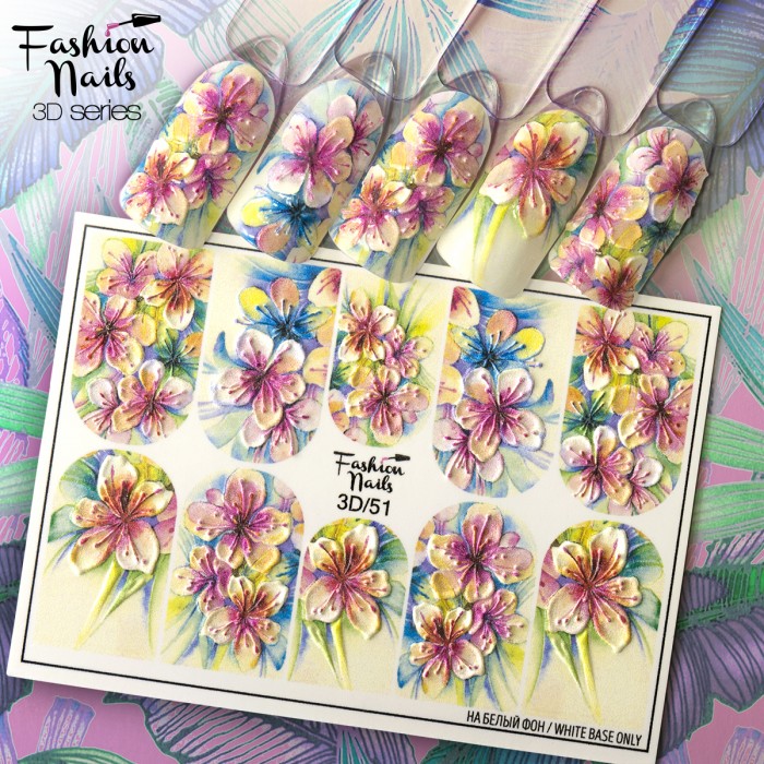 FASHION NAILS Water decal 3D #51, 1 pz. Istruzioni per l'uso: 1. Effettuare una preparazione standard della lamina ungueale.2. Selezionare il modello appropriato, tagliare l'immagine alla dimensione dell'unghia. 3. Applicare la base,polimerizzare. Applicare uno strato sottile del semipermanente bianco, se richiesto dal design del water decal. Polimerizzare. 4. Applicare uno strato sottile della base. Non polimerizzare. 5. Mettere il water decal su un disco di cotone inumidito con acqua calda (non fredda!) Per circa 10-15 secondi. Spostarlo trasferendo la pellicola sull'unghia. Raddrizzare la pellicola, tirando leggermente verso l'alto il bordo libero. Distendere con cura le pieghe, estraendo i resti di aria e acqua con un panno morbido, un pennello piatto o con le dita. Polimerizzare a tempo pieno. (UV - 2 min, led -30-60 sec). 6. Utilizzando la lima fine, dall'alto verso il basso, rimuovere delicatamente la pellicola in eccesso dal bordo libero dell'unghia. 7. Coprire 2 volte con il top coat, ben sigillando il bordo libero.