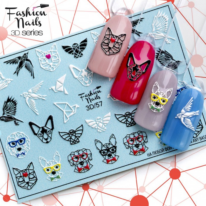 FASHION NAILS Water decal 3D #57, 1 pz. Istruzioni per l'uso: 1. Effettuare una preparazione standard della lamina ungueale.2. Selezionare il modello appropriato, tagliare l'immagine alla dimensione dell'unghia. 3. Applicare la base,polimerizzare. Applicare uno strato sottile del semipermanente bianco, se richiesto dal design del water decal. Polimerizzare. 4. Applicare uno strato sottile della base. Non polimerizzare. 5. Mettere il water decal su un disco di cotone inumidito con acqua calda (non fredda!) Per circa 10-15 secondi. Spostarlo trasferendo la pellicola sull'unghia. Raddrizzare la pellicola, tirando leggermente verso l'alto il bordo libero. Distendere con cura le pieghe, estraendo i resti di aria e acqua con un panno morbido, un pennello piatto o con le dita. Polimerizzare a tempo pieno. (UV - 2 min, led -30-60 sec). 6. Utilizzando la lima fine, dall'alto verso il basso, rimuovere delicatamente la pellicola in eccesso dal bordo libero dell'unghia. 7. Coprire 2 volte con il top coat, ben sigillando il bordo libero.