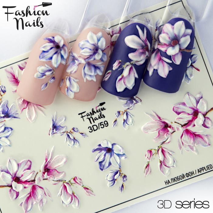 FASHION NAILS Water decal 3D #59, 1 pz. Istruzioni per l'uso: 1. Effettuare una preparazione standard della lamina ungueale.2. Selezionare il modello appropriato, tagliare l'immagine alla dimensione dell'unghia. 3. Applicare la base,polimerizzare. Applicare uno strato sottile del semipermanente bianco, se richiesto dal design del water decal. Polimerizzare. 4. Applicare uno strato sottile della base. Non polimerizzare. 5. Mettere il water decal su un disco di cotone inumidito con acqua calda (non fredda!) Per circa 10-15 secondi. Spostarlo trasferendo la pellicola sull'unghia. Raddrizzare la pellicola, tirando leggermente verso l'alto il bordo libero. Distendere con cura le pieghe, estraendo i resti di aria e acqua con un panno morbido, un pennello piatto o con le dita. Polimerizzare a tempo pieno. (UV - 2 min, led -30-60 sec). 6. Utilizzando la lima fine, dall'alto verso il basso, rimuovere delicatamente la pellicola in eccesso dal bordo libero dell'unghia. 7. Coprire 2 volte con il top coat, ben sigillando il bordo libero.