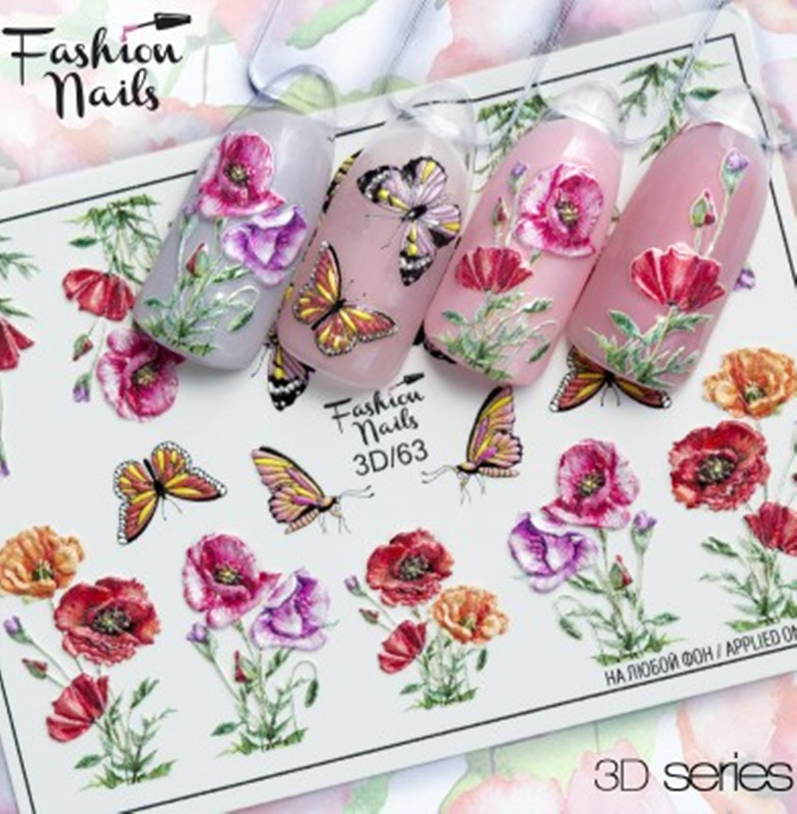 FASHION NAILS Water decal 3D #63, 1 pz. Istruzioni per l'uso: 1. Effettuare una preparazione standard della lamina ungueale.2. Selezionare il modello appropriato, tagliare l'immagine alla dimensione dell'unghia. 3. Applicare la base,polimerizzare. Applicare uno strato sottile del semipermanente bianco, se richiesto dal design del water decal. Polimerizzare. 4. Applicare uno strato sottile della base. Non polimerizzare. 5. Mettere il water decal su un disco di cotone inumidito con acqua calda (non fredda!) Per circa 10-15 secondi. Spostarlo trasferendo la pellicola sull'unghia. Raddrizzare la pellicola, tirando leggermente verso l'alto il bordo libero. Distendere con cura le pieghe, estraendo i resti di aria e acqua con un panno morbido, un pennello piatto o con le dita. Polimerizzare a tempo pieno. (UV - 2 min, led -30-60 sec). 6. Utilizzando la lima fine, dall'alto verso il basso, rimuovere delicatamente la pellicola in eccesso dal bordo libero dell'unghia. 7. Coprire 2 volte con il top coat, ben sigillando il bordo libero.