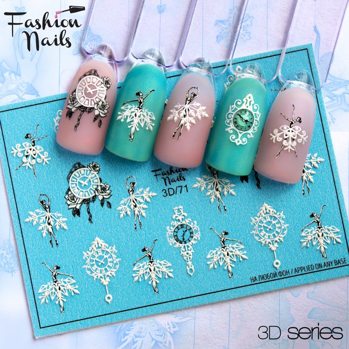 FASHION NAILS Water decal 3D #71, 1 pz. Istruzioni per l'uso: 1. Effettuare una preparazione standard della lamina ungueale.2. Selezionare il modello appropriato, tagliare l'immagine alla dimensione dell'unghia. 3. Applicare la base,polimerizzare. Applicare uno strato sottile del semipermanente bianco, se richiesto dal design del water decal. Polimerizzare. 4. Applicare uno strato sottile della base. Non polimerizzare. 5. Mettere il water decal su un disco di cotone inumidito con acqua calda (non fredda!) Per circa 10-15 secondi. Spostarlo trasferendo la pellicola sull'unghia. Raddrizzare la pellicola, tirando leggermente verso l'alto il bordo libero. Distendere con cura le pieghe, estraendo i resti di aria e acqua con un panno morbido, un pennello piatto o con le dita. Polimerizzare a tempo pieno. (UV - 2 min, led -30-60 sec). 6. Utilizzando la lima fine, dall'alto verso il basso, rimuovere delicatamente la pellicola in eccesso dal bordo libero dell'unghia. 7. Coprire 2 volte con il top coat, ben sigillando il bordo libero.