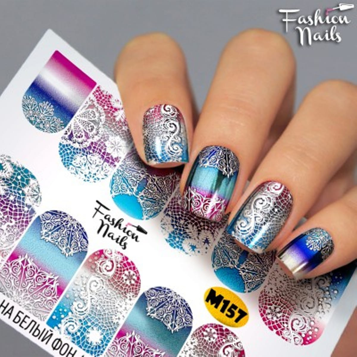 FASHION NAILS Water decal Metallic #157, 1 pz. Istruzioni per l'uso: 1. Effettuare una preparazione standard della lamina ungueale.2. Selezionare il modello appropriato, tagliare l'immagine alla dimensione dell'unghia. 3. Applicare la base,polimerizzare. Applicare uno strato sottile del semipermanente bianco, se richiesto dal design del water decal. Polimerizzare. 4. Applicare uno strato sottile della base. Non polimerizzare. 5. Mettere il water decal su un disco di cotone inumidito con acqua calda (non fredda!) Per circa 10-15 secondi. Spostarlo trasferendo la pellicola sull'unghia. Raddrizzare la pellicola, tirando leggermente verso l'alto il bordo libero. Distendere con cura le pieghe, estraendo i resti di aria e acqua con un panno morbido, un pennello piatto o con le dita. Polimerizzare a tempo pieno. (UV - 2 min, led -30-60 sec). 6. Utilizzando la lima fine, dall'alto verso il basso, rimuovere delicatamente la pellicola in eccesso dal bordo libero dell'unghia. 7. Coprire 2 volte con il top coat, ben sigillando il bordo libero.