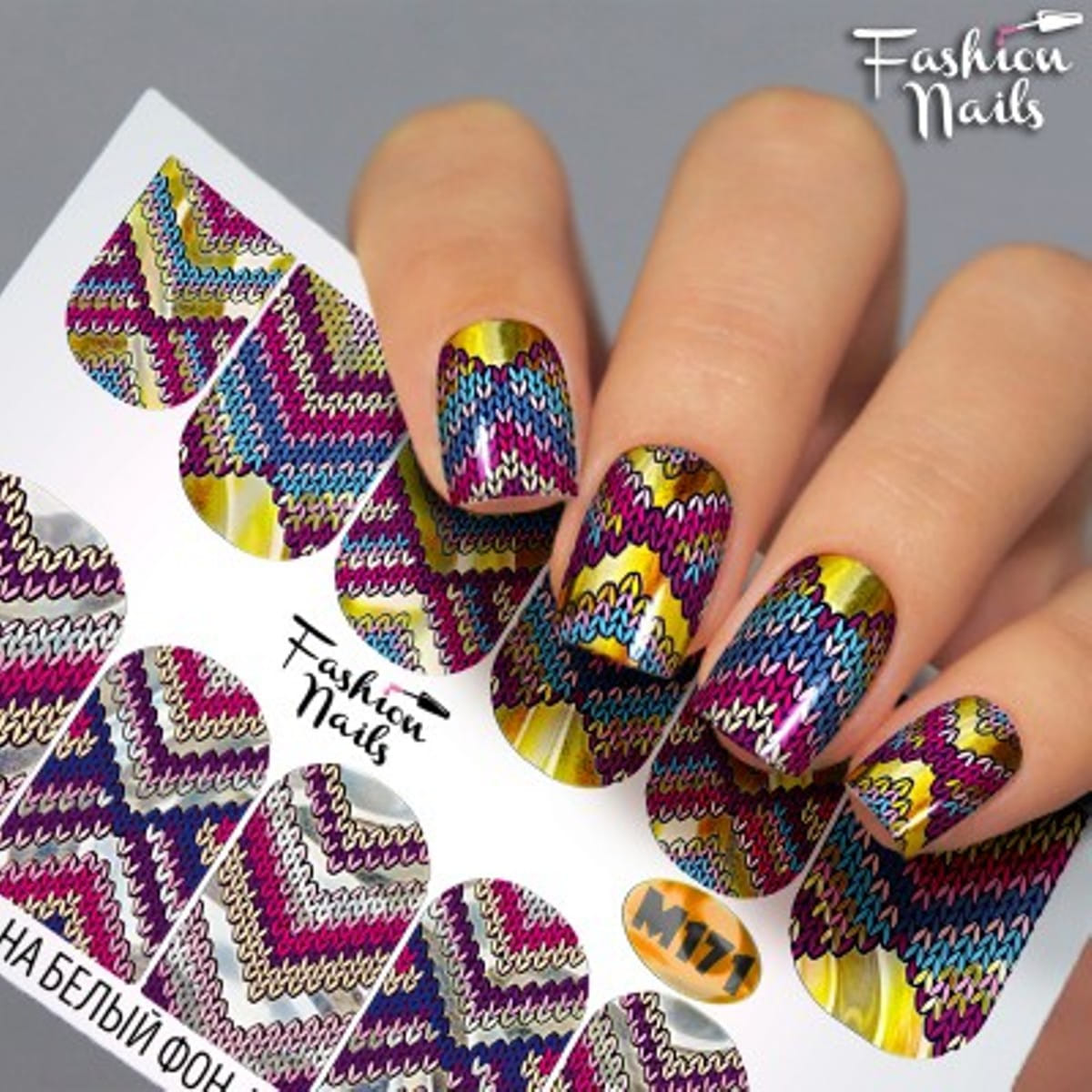 FASHION NAILS Water decal Metallic #171, 1 pz. Istruzioni per l'uso: 1. Effettuare una preparazione standard della lamina ungueale.2. Selezionare il modello appropriato, tagliare l'immagine alla dimensione dell'unghia. 3. Applicare la base,polimerizzare. Applicare uno strato sottile del semipermanente bianco, se richiesto dal design del water decal. Polimerizzare. 4. Applicare uno strato sottile della base. Non polimerizzare. 5. Mettere il water decal su un disco di cotone inumidito con acqua calda (non fredda!) Per circa 10-15 secondi. Spostarlo trasferendo la pellicola sull'unghia. Raddrizzare la pellicola, tirando leggermente verso l'alto il bordo libero. Distendere con cura le pieghe, estraendo i resti di aria e acqua con un panno morbido, un pennello piatto o con le dita. Polimerizzare a tempo pieno. (UV - 2 min, led -30-60 sec). 6. Utilizzando la lima fine, dall'alto verso il basso, rimuovere delicatamente la pellicola in eccesso dal bordo libero dell'unghia. 7. Coprire 2 volte con il top coat, ben sigillando il bordo libero.