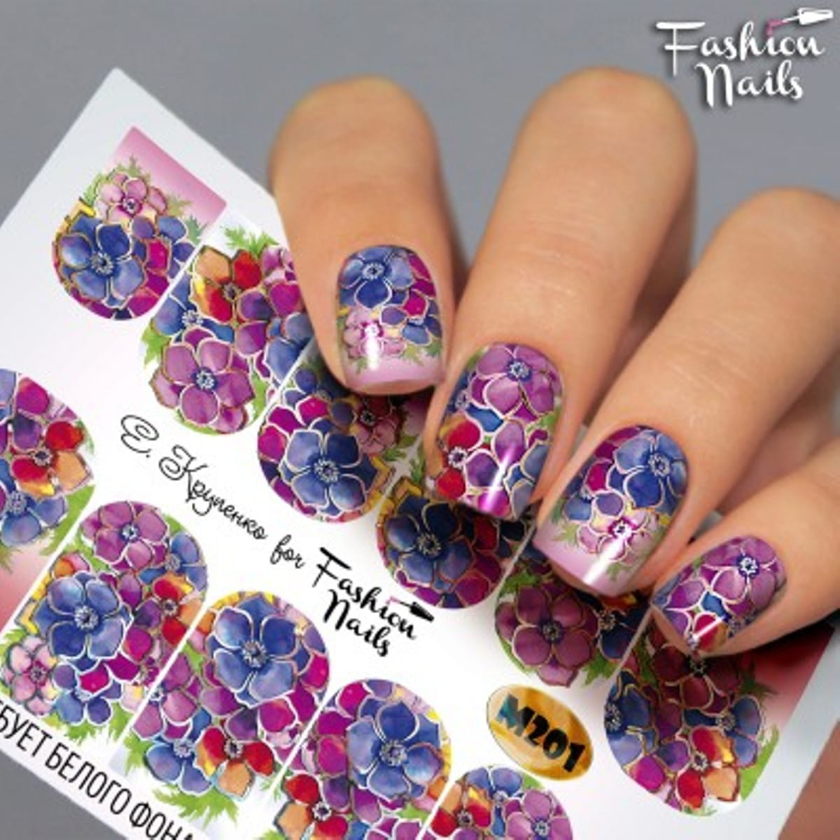 FASHION NAILS Water decal Metallic #201, 1 pz. Istruzioni per l'uso: 1. Effettuare una preparazione standard della lamina ungueale.2. Selezionare il modello appropriato, tagliare l'immagine alla dimensione dell'unghia. 3. Applicare la base,polimerizzare. Applicare uno strato sottile del semipermanente bianco, se richiesto dal design del water decal. Polimerizzare. 4. Applicare uno strato sottile della base. Non polimerizzare. 5. Mettere il water decal su un disco di cotone inumidito con acqua calda (non fredda!) Per circa 10-15 secondi. Spostarlo trasferendo la pellicola sull'unghia. Raddrizzare la pellicola, tirando leggermente verso l'alto il bordo libero. Distendere con cura le pieghe, estraendo i resti di aria e acqua con un panno morbido, un pennello piatto o con le dita. Polimerizzare a tempo pieno. (UV - 2 min, led -30-60 sec). 6. Utilizzando la lima fine, dall'alto verso il basso, rimuovere delicatamente la pellicola in eccesso dal bordo libero dell'unghia. 7. Coprire 2 volte con il top coat, ben sigillando il bordo libero.