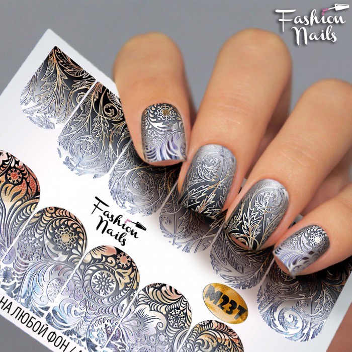 FASHION NAILS Water decal Metallic #237, 1 pz. Istruzioni per l'uso: 1. Effettuare una preparazione standard della lamina ungueale.2. Selezionare il modello appropriato, tagliare l'immagine alla dimensione dell'unghia. 3. Applicare la base,polimerizzare. Applicare uno strato sottile del semipermanente bianco, se richiesto dal design del water decal. Polimerizzare. 4. Applicare uno strato sottile della base. Non polimerizzare. 5. Mettere il water decal su un disco di cotone inumidito con acqua calda (non fredda!) Per circa 10-15 secondi. Spostarlo trasferendo la pellicola sull'unghia. Raddrizzare la pellicola, tirando leggermente verso l'alto il bordo libero. Distendere con cura le pieghe, estraendo i resti di aria e acqua con un panno morbido, un pennello piatto o con le dita. Polimerizzare a tempo pieno. (UV - 2 min, led -30-60 sec). 6. Utilizzando la lima fine, dall'alto verso il basso, rimuovere delicatamente la pellicola in eccesso dal bordo libero dell'unghia. 7. Coprire 2 volte con il top coat, ben sigillando il bordo libero.