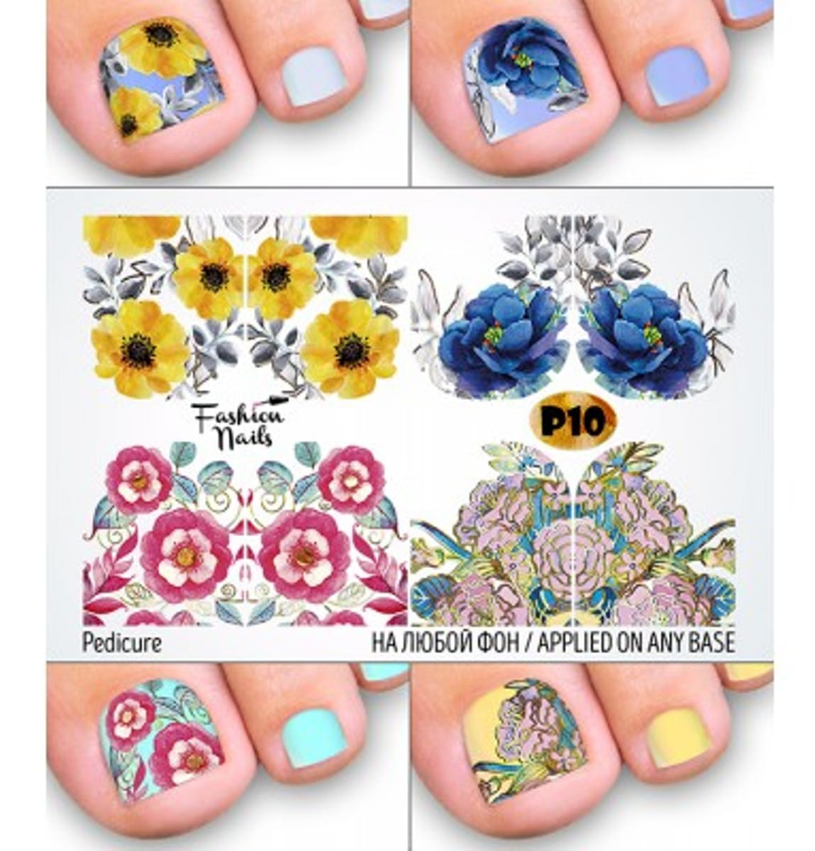 FASHION NAILS Water decal Metallic Pedicure #P10, 1 pz. Istruzioni per l'uso: 1. Effettuare una preparazione standard della lamina ungueale.2. Selezionare il modello appropriato, tagliare l'immagine alla dimensione dell'unghia. 3. Applicare la base,polimerizzare. Applicare uno strato sottile del semipermanente bianco, se richiesto dal design del water decal. Polimerizzare. 4. Applicare uno strato sottile della base. Non polimerizzare. 5. Mettere il water decal su un disco di cotone inumidito con acqua calda (non fredda!) Per circa 10-15 secondi. Spostarlo trasferendo la pellicola sull'unghia. Raddrizzare la pellicola, tirando leggermente verso l'alto il bordo libero. Distendere con cura le pieghe, estraendo i resti di aria e acqua con un panno morbido, un pennello piatto o con le dita. Polimerizzare a tempo pieno. (UV - 2 min, led -30-60 sec). 6. Utilizzando la lima fine, dall'alto verso il basso, rimuovere delicatamente la pellicola in eccesso dal bordo libero dell'unghia. 7. Coprire 2 volte con il top coat, ben sigillando il bordo libero.