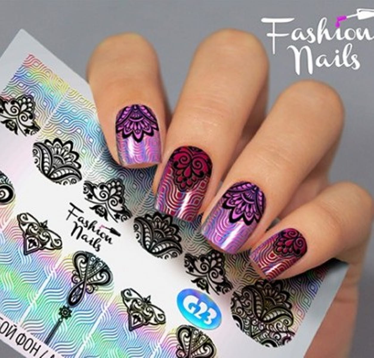 FASHION NAILS Water decal Galaxy 23, 1 pz. Istruzioni per l'uso: 1. Effettuare una preparazione standard della lamina ungueale.2. Selezionare il modello appropriato, tagliare l'immagine alla dimensione dell'unghia. 3. Applicare la base,polimerizzare. Applicare uno strato sottile del semipermanente bianco, se richiesto dal design del water decal. Polimerizzare. 4. Applicare uno strato sottile della base. Non polimerizzare. 5. Mettere il water decal su un disco di cotone inumidito con acqua calda (non fredda!) Per circa 10-15 secondi. Spostarlo trasferendo la pellicola sull'unghia. Raddrizzare la pellicola, tirando leggermente verso l'alto il bordo libero. Distendere con cura le pieghe, estraendo i resti di aria e acqua con un panno morbido, un pennello piatto o con le dita. Polimerizzare a tempo pieno. (UV - 2 min, led -30-60 sec). 6. Utilizzando la lima fine, dall'alto verso il basso, rimuovere delicatamente la pellicola in eccesso dal bordo libero dell'unghia. 7. Coprire 2 volte con il top coat, ben sigillando il bordo libero.