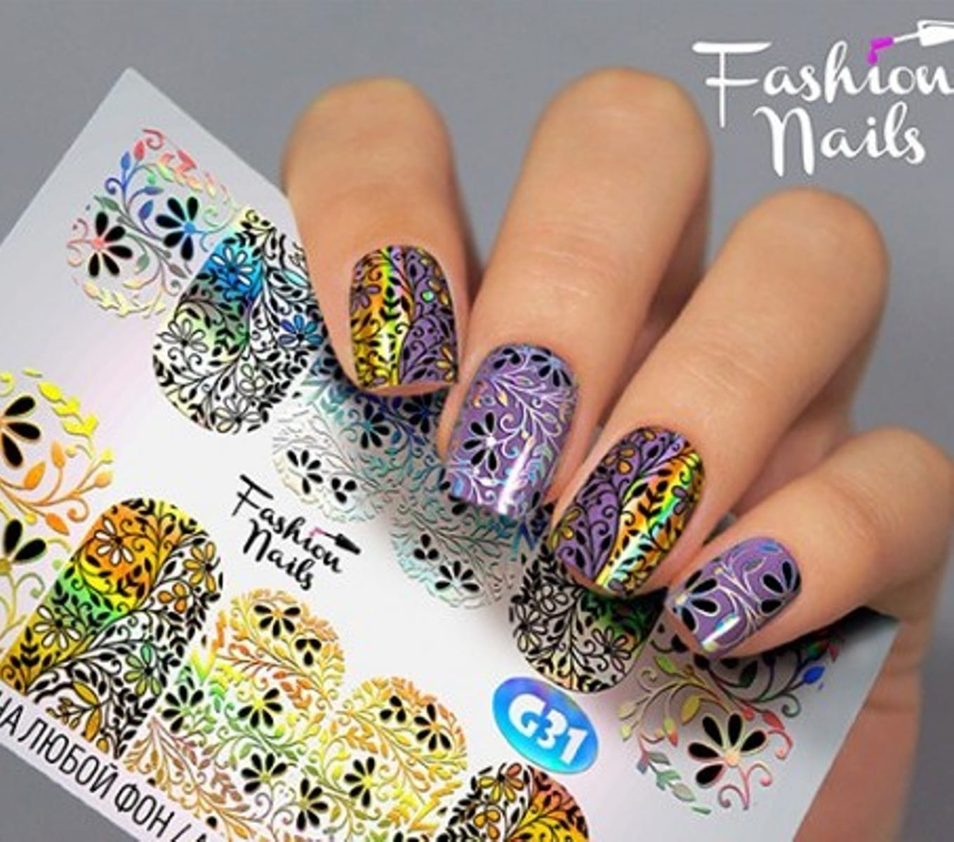 FASHION NAILS Water decal Galaxy 31, 1 pz. Istruzioni per l'uso: 1. Effettuare una preparazione standard della lamina ungueale.2. Selezionare il modello appropriato, tagliare l'immagine alla dimensione dell'unghia. 3. Applicare la base,polimerizzare. Applicare uno strato sottile del semipermanente bianco, se richiesto dal design del water decal. Polimerizzare. 4. Applicare uno strato sottile della base. Non polimerizzare. 5. Mettere il water decal su un disco di cotone inumidito con acqua calda (non fredda!) Per circa 10-15 secondi. Spostarlo trasferendo la pellicola sull'unghia. Raddrizzare la pellicola, tirando leggermente verso l'alto il bordo libero. Distendere con cura le pieghe, estraendo i resti di aria e acqua con un panno morbido, un pennello piatto o con le dita. Polimerizzare a tempo pieno. (UV - 2 min, led -30-60 sec). 6. Utilizzando la lima fine, dall'alto verso il basso, rimuovere delicatamente la pellicola in eccesso dal bordo libero dell'unghia. 7. Coprire 2 volte con il top coat, ben sigillando il bordo libero.