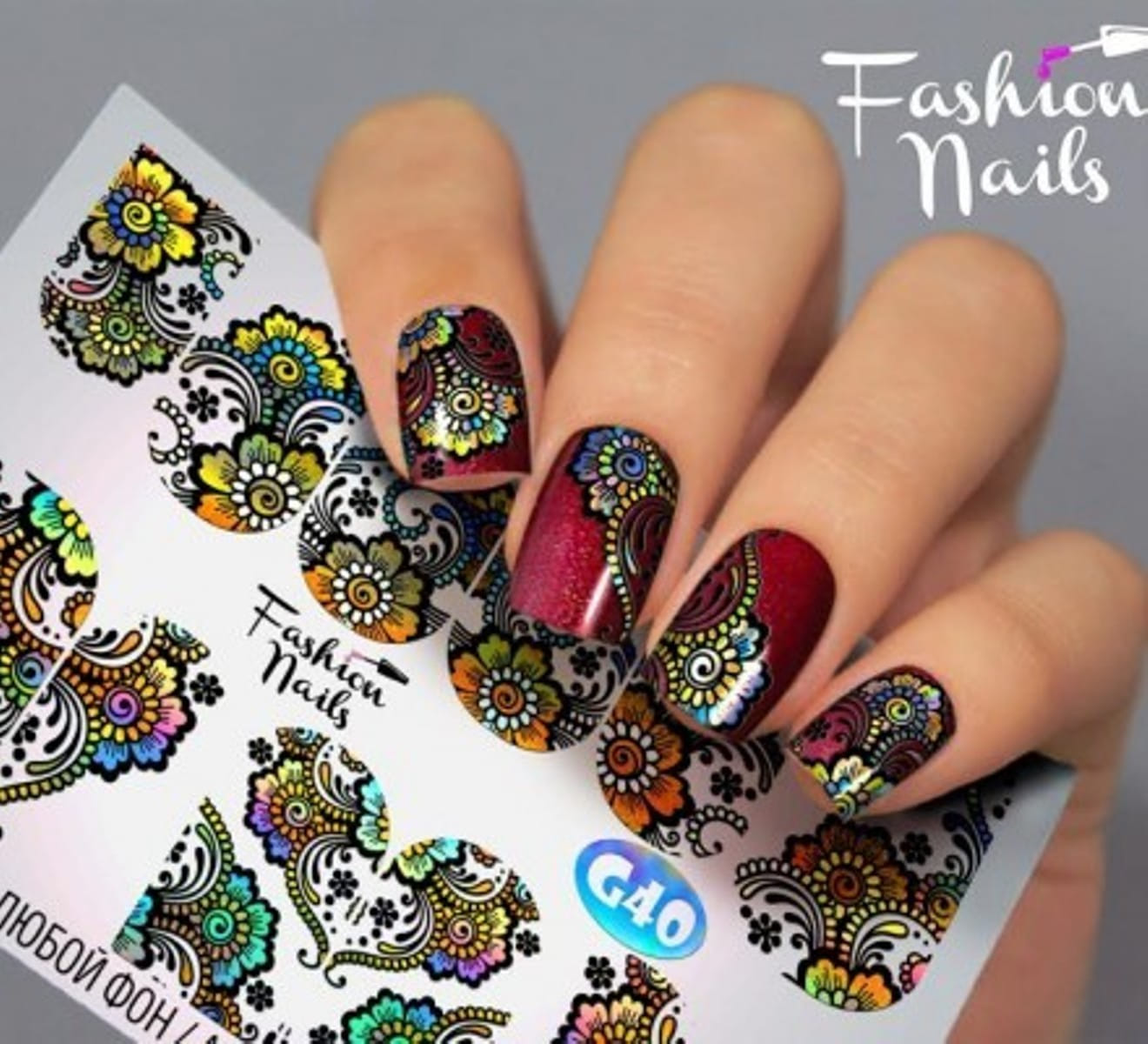 FASHION NAILS Water decal Galaxy 40, 1 pz. Istruzioni per l'uso: 1. Effettuare una preparazione standard della lamina ungueale.2. Selezionare il modello appropriato, tagliare l'immagine alla dimensione dell'unghia. 3. Applicare la base,polimerizzare. Applicare uno strato sottile del semipermanente bianco, se richiesto dal design del water decal. Polimerizzare. 4. Applicare uno strato sottile della base. Non polimerizzare. 5. Mettere il water decal su un disco di cotone inumidito con acqua calda (non fredda!) Per circa 10-15 secondi. Spostarlo trasferendo la pellicola sull'unghia. Raddrizzare la pellicola, tirando leggermente verso l'alto il bordo libero. Distendere con cura le pieghe, estraendo i resti di aria e acqua con un panno morbido, un pennello piatto o con le dita. Polimerizzare a tempo pieno. (UV - 2 min, led -30-60 sec). 6. Utilizzando la lima fine, dall'alto verso il basso, rimuovere delicatamente la pellicola in eccesso dal bordo libero dell'unghia. 7. Coprire 2 volte con il top coat, ben sigillando il bordo libero.