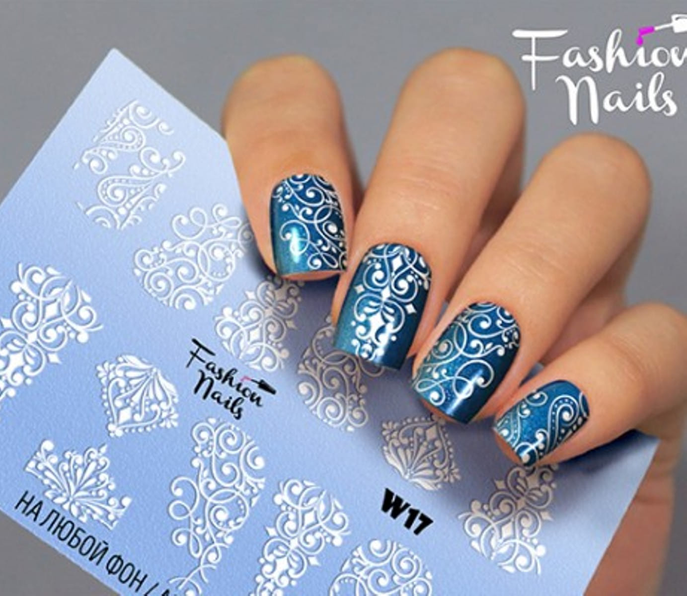 FASHION NAILS Water decal WHITE 17, 1 pz. Istruzioni per l'uso: 1. Effettuare una preparazione standard della lamina ungueale.2. Selezionare il modello appropriato, tagliare l'immagine alla dimensione dell'unghia. 3. Applicare la base,polimerizzare. Applicare uno strato sottile del semipermanente bianco, se richiesto dal design del water decal. Polimerizzare. 4. Applicare uno strato sottile della base. Non polimerizzare. 5. Mettere il water decal su un disco di cotone inumidito con acqua calda (non fredda!) Per circa 10-15 secondi. Spostarlo trasferendo la pellicola sull'unghia. Raddrizzare la pellicola, tirando leggermente verso l'alto il bordo libero. Distendere con cura le pieghe, estraendo i resti di aria e acqua con un panno morbido, un pennello piatto o con le dita. Polimerizzare a tempo pieno. (UV - 2 min, led -30-60 sec). 6. Utilizzando la lima fine, dall'alto verso il basso, rimuovere delicatamente la pellicola in eccesso dal bordo libero dell'unghia. 7. Coprire 2 volte con il top coat, ben sigillando il bordo libero.