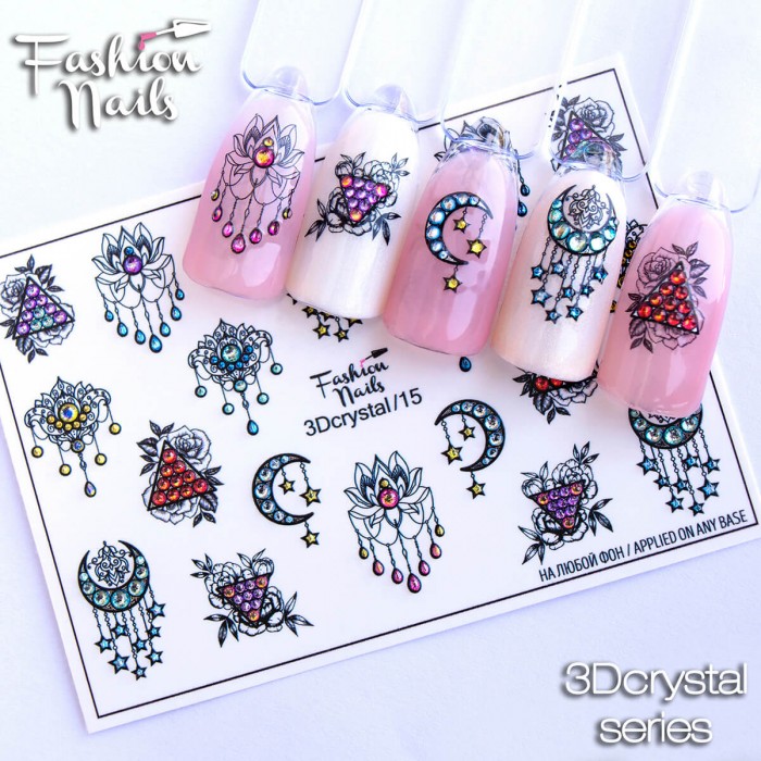 FASHION NAILS Water decal 3D crystal #15, 1 pz. Istruzioni per l'uso: 1. Effettuare una preparazione standard della lamina ungueale.2. Selezionare il modello appropriato, tagliare l'immagine alla dimensione dell'unghia. 3. Applicare la base,polimerizzare. Applicare uno strato sottile del semipermanente bianco, se richiesto dal design del water decal. Polimerizzare. 4. Applicare uno strato sottile della base. Non polimerizzare. 5. Mettere il water decal su un disco di cotone inumidito con acqua calda (non fredda!) Per circa 10-15 secondi. Spostarlo trasferendo la pellicola sull'unghia. Raddrizzare la pellicola, tirando leggermente verso l'alto il bordo libero. Distendere con cura le pieghe, estraendo i resti di aria e acqua con un panno morbido, un pennello piatto o con le dita. Polimerizzare a tempo pieno. (UV - 2 min, led -30-60 sec). 6. Utilizzando la lima fine, dall'alto verso il basso, rimuovere delicatamente la pellicola in eccesso dal bordo libero dell'unghia. 7. Coprire 2 volte con il top coat, ben sigillando il bordo libero.