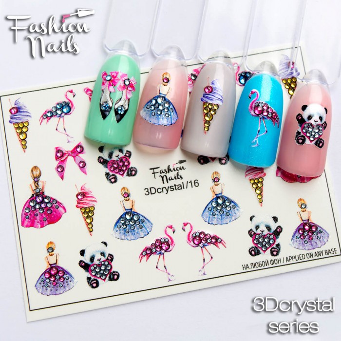 FASHION NAILS Water decal 3D crystal #16, 1 pz. Istruzioni per l'uso: 1. Effettuare una preparazione standard della lamina ungueale.2. Selezionare il modello appropriato, tagliare l'immagine alla dimensione dell'unghia. 3. Applicare la base,polimerizzare. Applicare uno strato sottile del semipermanente bianco, se richiesto dal design del water decal. Polimerizzare. 4. Applicare uno strato sottile della base. Non polimerizzare. 5. Mettere il water decal su un disco di cotone inumidito con acqua calda (non fredda!) Per circa 10-15 secondi. Spostarlo trasferendo la pellicola sull'unghia. Raddrizzare la pellicola, tirando leggermente verso l'alto il bordo libero. Distendere con cura le pieghe, estraendo i resti di aria e acqua con un panno morbido, un pennello piatto o con le dita. Polimerizzare a tempo pieno. (UV - 2 min, led -30-60 sec). 6. Utilizzando la lima fine, dall'alto verso il basso, rimuovere delicatamente la pellicola in eccesso dal bordo libero dell'unghia. 7. Coprire 2 volte con il top coat, ben sigillando il bordo libero.