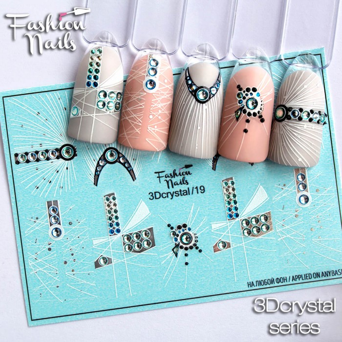 FASHION NAILS Water decal 3D crystal #19, 1 pz. Istruzioni per l'uso: 1. Effettuare una preparazione standard della lamina ungueale.2. Selezionare il modello appropriato, tagliare l'immagine alla dimensione dell'unghia. 3. Applicare la base,polimerizzare. Applicare uno strato sottile del semipermanente bianco, se richiesto dal design del water decal. Polimerizzare. 4. Applicare uno strato sottile della base. Non polimerizzare. 5. Mettere il water decal su un disco di cotone inumidito con acqua calda (non fredda!) Per circa 10-15 secondi. Spostarlo trasferendo la pellicola sull'unghia. Raddrizzare la pellicola, tirando leggermente verso l'alto il bordo libero. Distendere con cura le pieghe, estraendo i resti di aria e acqua con un panno morbido, un pennello piatto o con le dita. Polimerizzare a tempo pieno. (UV - 2 min, led -30-60 sec). 6. Utilizzando la lima fine, dall'alto verso il basso, rimuovere delicatamente la pellicola in eccesso dal bordo libero dell'unghia. 7. Coprire 2 volte con il top coat, ben sigillando il bordo libero.