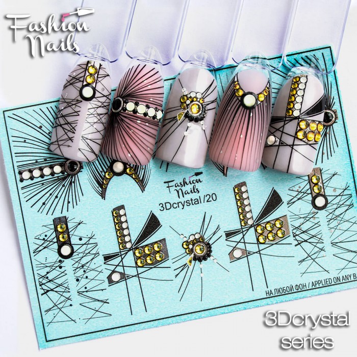 FASHION NAILS Water decal 3D crystal #20, 1 pz. Istruzioni per l'uso: 1. Effettuare una preparazione standard della lamina ungueale.2. Selezionare il modello appropriato, tagliare l'immagine alla dimensione dell'unghia. 3. Applicare la base,polimerizzare. Applicare uno strato sottile del semipermanente bianco, se richiesto dal design del water decal. Polimerizzare. 4. Applicare uno strato sottile della base. Non polimerizzare. 5. Mettere il water decal su un disco di cotone inumidito con acqua calda (non fredda!) Per circa 10-15 secondi. Spostarlo trasferendo la pellicola sull'unghia. Raddrizzare la pellicola, tirando leggermente verso l'alto il bordo libero. Distendere con cura le pieghe, estraendo i resti di aria e acqua con un panno morbido, un pennello piatto o con le dita. Polimerizzare a tempo pieno. (UV - 2 min, led -30-60 sec). 6. Utilizzando la lima fine, dall'alto verso il basso, rimuovere delicatamente la pellicola in eccesso dal bordo libero dell'unghia. 7. Coprire 2 volte con il top coat, ben sigillando il bordo libero.