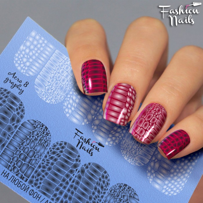 FASHION NAILS Water decal AEROGRAPHY 08, 1 pz. Istruzioni per l'uso: 1. Effettuare una preparazione standard della lamina ungueale.2. Selezionare il modello appropriato, tagliare l'immagine alla dimensione dell'unghia. 3. Applicare la base,polimerizzare. Applicare uno strato sottile del semipermanente bianco, se richiesto dal design del water decal. Polimerizzare. 4. Applicare uno strato sottile della base. Non polimerizzare. 5. Mettere il water decal su un disco di cotone inumidito con acqua calda (non fredda!) Per circa 10-15 secondi. Spostarlo trasferendo la pellicola sull'unghia. Raddrizzare la pellicola, tirando leggermente verso l'alto il bordo libero. Distendere con cura le pieghe, estraendo i resti di aria e acqua con un panno morbido, un pennello piatto o con le dita. Polimerizzare a tempo pieno. (UV - 2 min, led -30-60 sec). 6. Utilizzando la lima fine, dall'alto verso il basso, rimuovere delicatamente la pellicola in eccesso dal bordo libero dell'unghia. 7. Coprire 2 volte con il top coat, ben sigillando il bordo libero.