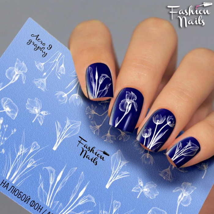 FASHION NAILS Water decal AEROGRAPHY 09, 1 pz. Istruzioni per l'uso: 1. Effettuare una preparazione standard della lamina ungueale.2. Selezionare il modello appropriato, tagliare l'immagine alla dimensione dell'unghia. 3. Applicare la base,polimerizzare. Applicare uno strato sottile del semipermanente bianco, se richiesto dal design del water decal. Polimerizzare. 4. Applicare uno strato sottile della base. Non polimerizzare. 5. Mettere il water decal su un disco di cotone inumidito con acqua calda (non fredda!) Per circa 10-15 secondi. Spostarlo trasferendo la pellicola sull'unghia. Raddrizzare la pellicola, tirando leggermente verso l'alto il bordo libero. Distendere con cura le pieghe, estraendo i resti di aria e acqua con un panno morbido, un pennello piatto o con le dita. Polimerizzare a tempo pieno. (UV - 2 min, led -30-60 sec). 6. Utilizzando la lima fine, dall'alto verso il basso, rimuovere delicatamente la pellicola in eccesso dal bordo libero dell'unghia. 7. Coprire 2 volte con il top coat, ben sigillando il bordo libero.