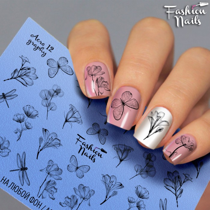 FASHION NAILS Water decal AEROGRAPHY 12, 1 pz. Istruzioni per l'uso: 1. Effettuare una preparazione standard della lamina ungueale.2. Selezionare il modello appropriato, tagliare l'immagine alla dimensione dell'unghia. 3. Applicare la base,polimerizzare. Applicare uno strato sottile del semipermanente bianco, se richiesto dal design del water decal. Polimerizzare. 4. Applicare uno strato sottile della base. Non polimerizzare. 5. Mettere il water decal su un disco di cotone inumidito con acqua calda (non fredda!) Per circa 10-15 secondi. Spostarlo trasferendo la pellicola sull'unghia. Raddrizzare la pellicola, tirando leggermente verso l'alto il bordo libero. Distendere con cura le pieghe, estraendo i resti di aria e acqua con un panno morbido, un pennello piatto o con le dita. Polimerizzare a tempo pieno. (UV - 2 min, led -30-60 sec). 6. Utilizzando la lima fine, dall'alto verso il basso, rimuovere delicatamente la pellicola in eccesso dal bordo libero dell'unghia. 7. Coprire 2 volte con il top coat, ben sigillando il bordo libero.