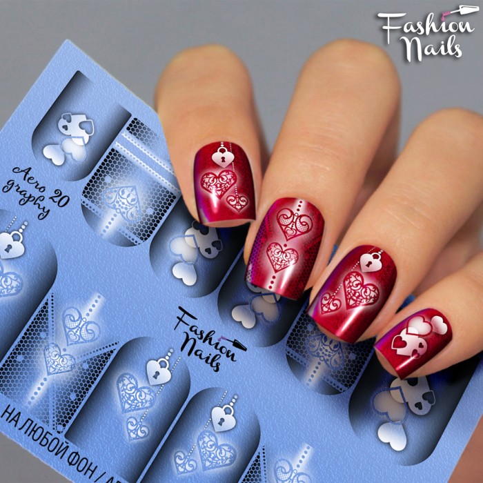 FASHION NAILS Water decal AEROGRAPHY 20, 1 pz. Istruzioni per l'uso: 1. Effettuare una preparazione standard della lamina ungueale.2. Selezionare il modello appropriato, tagliare l'immagine alla dimensione dell'unghia. 3. Applicare la base,polimerizzare. Applicare uno strato sottile del semipermanente bianco, se richiesto dal design del water decal. Polimerizzare. 4. Applicare uno strato sottile della base. Non polimerizzare. 5. Mettere il water decal su un disco di cotone inumidito con acqua calda (non fredda!) Per circa 10-15 secondi. Spostarlo trasferendo la pellicola sull'unghia. Raddrizzare la pellicola, tirando leggermente verso l'alto il bordo libero. Distendere con cura le pieghe, estraendo i resti di aria e acqua con un panno morbido, un pennello piatto o con le dita. Polimerizzare a tempo pieno. (UV - 2 min, led -30-60 sec). 6. Utilizzando la lima fine, dall'alto verso il basso, rimuovere delicatamente la pellicola in eccesso dal bordo libero dell'unghia. 7. Coprire 2 volte con il top coat, ben sigillando il bordo libero.