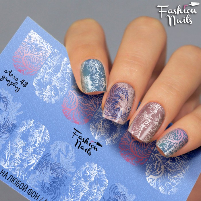 FASHION NAILS Water decal AEROGRAPHY 43, 1 pz. Istruzioni per l'uso: 1. Effettuare una preparazione standard della lamina ungueale.2. Selezionare il modello appropriato, tagliare l'immagine alla dimensione dell'unghia. 3. Applicare la base,polimerizzare. Applicare uno strato sottile del semipermanente bianco, se richiesto dal design del water decal. Polimerizzare. 4. Applicare uno strato sottile della base. Non polimerizzare. 5. Mettere il water decal su un disco di cotone inumidito con acqua calda (non fredda!) Per circa 10-15 secondi. Spostarlo trasferendo la pellicola sull'unghia. Raddrizzare la pellicola, tirando leggermente verso l'alto il bordo libero. Distendere con cura le pieghe, estraendo i resti di aria e acqua con un panno morbido, un pennello piatto o con le dita. Polimerizzare a tempo pieno. (UV - 2 min, led -30-60 sec). 6. Utilizzando la lima fine, dall'alto verso il basso, rimuovere delicatamente la pellicola in eccesso dal bordo libero dell'unghia. 7. Coprire 2 volte con il top coat, ben sigillando il bordo libero.