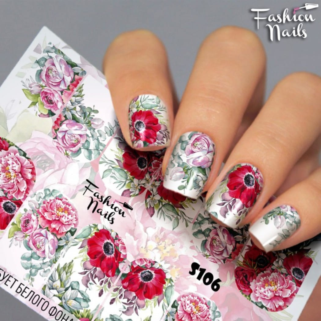FASHION NAILS Water decal Stretch #106, 1 pz. Istruzioni per l'uso: 1. Effettuare una preparazione standard della lamina ungueale.2. Selezionare il modello appropriato, tagliare l'immagine alla dimensione dell'unghia. 3. Applicare la base,polimerizzare. Applicare uno strato sottile del semipermanente bianco, se richiesto dal design del water decal. Polimerizzare. 4. Applicare uno strato sottile della base. Non polimerizzare. 5. Mettere il water decal su un disco di cotone inumidito con acqua calda (non fredda!) Per circa 10-15 secondi. Spostarlo trasferendo la pellicola sull'unghia. Raddrizzare la pellicola, tirando leggermente verso l'alto il bordo libero. Distendere con cura le pieghe, estraendo i resti di aria e acqua con un panno morbido, un pennello piatto o con le dita. Polimerizzare a tempo pieno. (UV - 2 min, led -30-60 sec). 6. Utilizzando la lima fine, dall'alto verso il basso, rimuovere delicatamente la pellicola in eccesso dal bordo libero dell'unghia. 7. Coprire 2 volte con il top coat, ben sigillando il bordo libero.